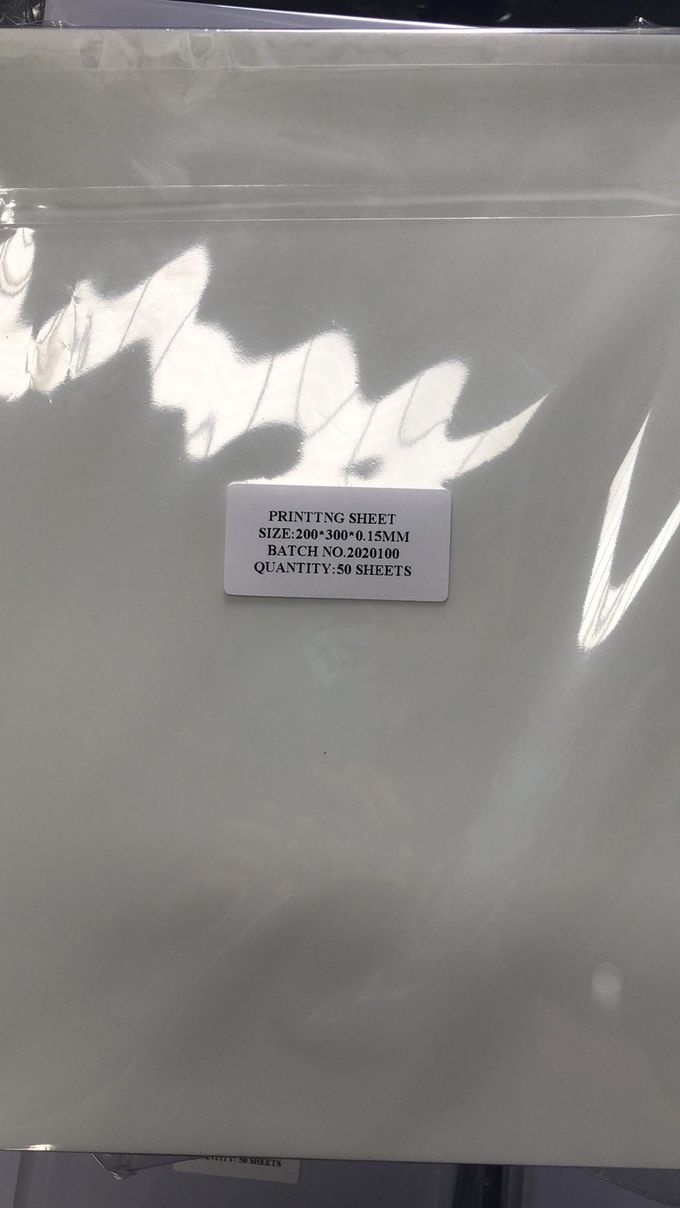 Specification and package one set include 3 pieces(0.15mm printing sheet+0.46 white core sheet +0.15 printing sheet), normal size 200mm*300mm,50sets/box,10boxs/carton, net weight 36.8kgs, gross weight 37.8kgs, package can be neutral, brand name or customized