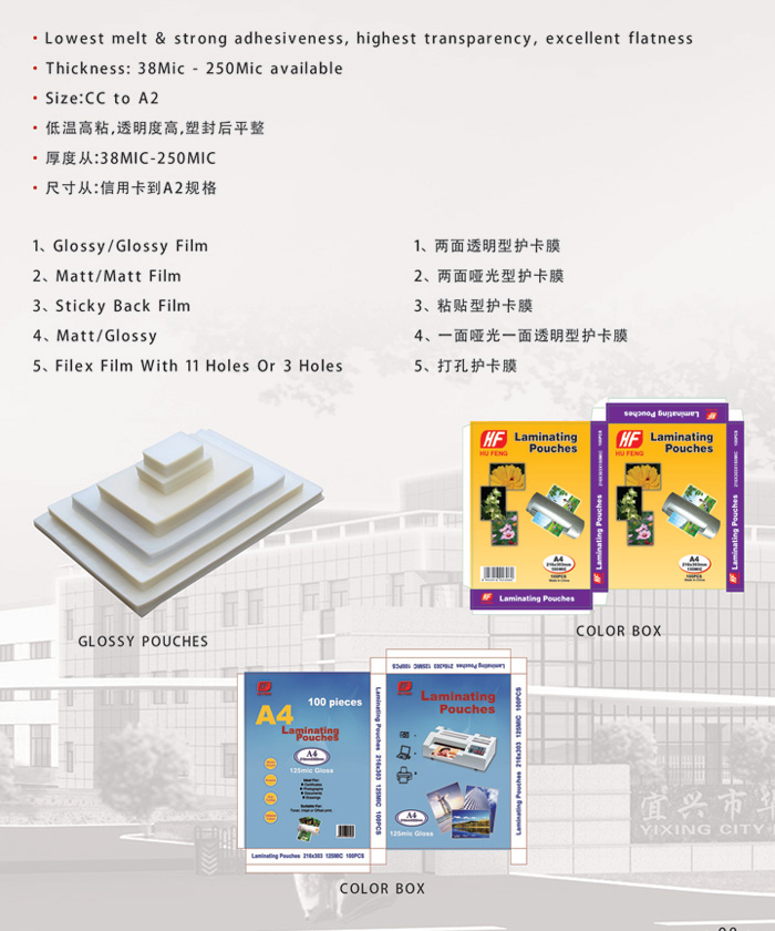 We are earliest laminating pouches & roll film factory in China(Since 1985).In China,only we used Japanese EVA raw materials to make laminating pouches & roll film.
