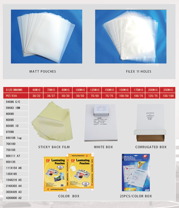 Laminating films use polyester (PET) film as its base film, adhesive (EVA resin) is evenly applied on one side of the polyester (PET) film. After special processing,it turned into advanced packing material, and it is widely used for the laminating and protection of material like identification card, historical accounts, photos, pictures, credit cards and important documents. After laminating, the material has the unique function like water resistance, alteration resistance, damp resistance, worm resistance and mildew resistance on general acid-base. What's more, it is stiff, smooth and pleasing to one's eyes.
